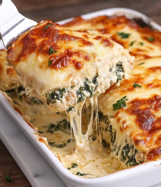 This Creamy Spinach & Cheese Stuffed Chicken Bake is a rich, flavorful dish featuring juicy chicken breasts stuffed with a creamy mixture of spinach, cheese, and garlic. Baked to perfection, this meal is a perfect balance of indulgence and nutrition. It’s great for a comforting dinner and pairs well with roasted vegetables, rice, or a fresh salad.