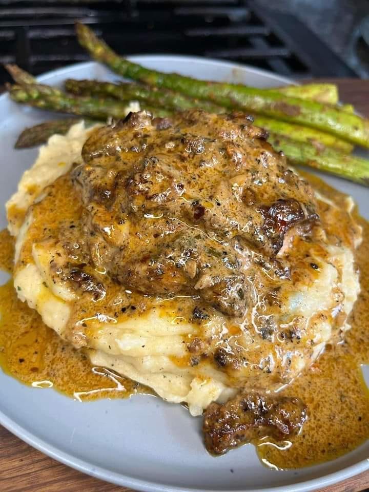Pour sauce over chicken and bake in oven for 30-35min on 400 degrees. Serve over Mashed Potatoes